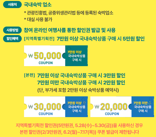 숙박할인쿠폰은 5월28일부터 오전 10시부터 5월30일까지 1인당 1회,선착순으로 발급되며,발급 당일 오전 10시부터 다음날 오전 7시까지 유효합니다.